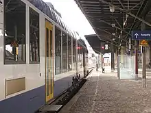 Even before the suspension of traffic on the line to Frose, there were plans to extend the narrow-gauge Selke Valley Railway (Selketalbahn) from Gernrode to Quedlinburg to increase its attractiveness. Originally, the connection was to have been made by installing dual gauge track. After the closure of the standard-gauge line, these plans were abandoned and the Gernrode–Quedlinburg section was regauged.[25] Due to the well-preserved embankment, the construction time was just under a year, with almost all level crossings modernised or replaced by automatic systems. Platform 3 has since then been used as the terminus of the Selke Valley Railway, which has a siding next to a bypass track to handle steam locomotives. In addition, a new water crane was installed at the end of the platform. There are several train journeys daily from Quedlinburg via Gernrode to Eisfelder Talmühle, two of them steam-hauled. Several special excursions have run directly to Brocken. Passenger traffic on the Selke Valley Railway has increased by 20% as a result of the extension to Quedlinburg.[8]