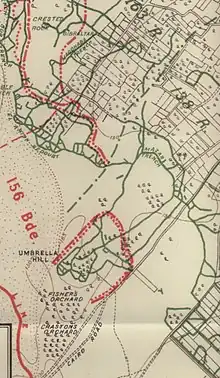 The Turks withdrew to defend the Wadi el Hesi, with 52nd (L) Division well up in pursuit. 156th Brigade was left marching in the rear as the rest of the division stormed the wadi and led the pursuit up the coast towards Junction Station.[38][67][68][69] 4th Royal Scots under Lt-Col Mitchell distinguished itself in a successful attack on a Turkish rearguard position at 'Brown Hill' near Burkah, 25 miles (40 km) NE of Gaza City on 11 November. The hill was strongly entrenched, but the battalion advanced 1 mile (1.6 km) under Shrapnel shell fire with one company echeloned back to protect the flank. Rushing forward in small parties, the assault wave gathered in the shelter of a wadi at the foot of the hill, and then attacked under covering fire from artillery and machine guns. Having taken the position the Royal Scots discovered a second untouched Turkish line hidden on the reverse slope; they were counter-attacked from this line and pushed part-way back down the hill, but led the reinforcing 2/3rd Gurkha Rifles back up the hill to capture the position before the end of the day. The battalion, already weak, lost 3 officers and 49 ORs killed, 4 officers and 157 ORs wounded.[54][64][70]