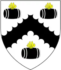 | Incledon: Argent, a chevron engrailed between three tuns sable fire issuing from the bung hole proper (canting arms from Latin incend(ere), "to kindle, set fire to, burn",[48] hence incendiary, etc., + tun). For Henry Incledon (1671-1736) of Buckland House, Braunton, a son-in-law of John Davie, and elder brother of Robert Incledon (1676-1758), the latter who as Mayor of Barnstaple supervised the construction of the building and whose arms are shown on the east side of the parapet. Their mother was a grand-daughter of Francis Fane, 1st Earl of Westmorland (1580-1629) and a niece of Rachel Fane, wife of Henry Bourchier, 5th Earl of Bath (1587-1654), of Tawstock Court, the leading Royalist in Devon during the Civil War. The ancient building known as the "Three Tuns" survives on the west side of the High Street.[10] The family was one of the oldest in Devon, first recorded in 1160 as resident at the manor of Incledon,[49] in the parish of Braunton, still owned today, with Buckland, by their descendant via various female lines. | ||||