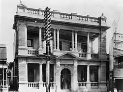 QNB's new two storey bank building was depicted in a c. 1895 photograph as a prominent feature of the street, with a symmetrical street elevation and Classical architectural ornamentation. Its street elevation had a central pediment and entry, and colonnaded ground and first floor verandahs, framed by corner pillars inscribed to appear as ashlar. The entablature over the first floor contained "QUEENSLAND NATIONAL BANK LIMITED 1891" in large lettering, and a balustrade parapet concealed the roof from the street.[30] Early plans show the building provided banking facilities on the ground floor, including entrance hall, gold room, manager's office, main banking chamber, stationery room, and a strong room; and the first floor accommodated a manager's residence comprising two bedrooms, drawing room, and a rear verandah with bathroom enclosure.[31][1]