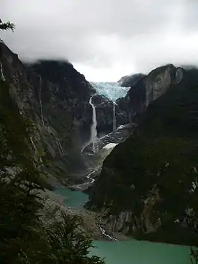 Cascada de Ventisquero Colgante, a large waterfall, is located in the park.[2] As the meltwaters of the eponymous glacier proceed into the Témpanos River, they fall down the waterfall's single vertical drop.[3][2]