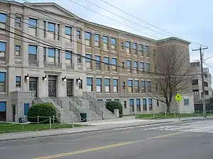 The now-demolished 1924 building of Quincy High School; the new school is to the right of the photo, in the place of the now-demolished Vocational Center depicted.