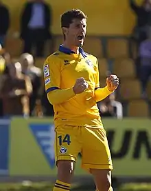 At the age of already 30, Quini made his Segunda División debut, with AD Alcorcón with whom he had already played six years before.[3] He finished the 2010–11 campaign with 22 goals, fifth-best in the competition as the team easily retained their newly acquired status; highlights included a hat-trick against Girona FC (3–1 home win)[4] and braces against SD Ponferradina (2–0, home),[5] Xerez CD (3–1, home),[6] Córdoba CF (2–1 at home),[7] UD Las Palmas (5–0, home)[8] and CD Tenerife (3–2 home victory).[9]
