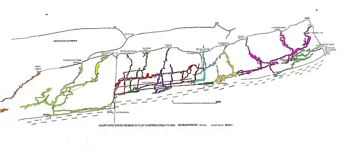 The Réseau du Clot d'Aspres is a cave system located mainly under the valley of Clot d'Aspres, which lies within the commune of Villard-de-Lans in the north of the Vercors Massif, in Isère, France.[1] This extensive karst system contains 42 kilometres (26 mi) of passages over a height range of 1,066 meters. The highest point is upstream of the Oréade cave +74 metres (243 ft), and the lowest point is the siphon of the Nuits-Blanches scialet which has been dived to a depth of 34 metres (112 ft).