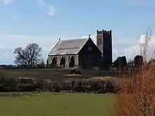 To this day, within easy view of the airfield, is the (still) stunted tower of the parish church of St. Andrew (in Manx Gaelic, Andrew translates to Andreas), a permanent legacy of Royal Air Force Andreas, and below which lie twenty-three military graves.[12][44]