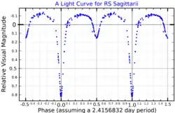 RS Sagittarii is an eclipsing binary star system in the southern constellation of Sagittarius, abbreviated RS Sgr. It is a double-lined spectroscopic binary with an orbital period of 2.416 days,[8] indicating that the components are too close to each other to be individually resolved. The system has a combined apparent visual magnitude of 6.01, which is bright enough to be faintly visible to the naked eye. During the primary eclipse the brightness drops to magnitude 6.97, while the secondary eclipse is of magnitude 6.28.[3] The distance to this system is approximately 1,420 light years based on parallax measurements.[2]