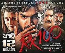 RX 100 is a 2018 Indian Telugu-language romantic action drama film written and directed by Ajay Bhupathi.[5] The film stars Kartikeya Gummakonda and Payal Rajput with Rao Ramesh and Ramki playing supporting roles.[6] The film released on 12 July 2018.