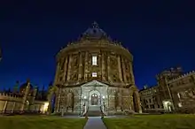 The Radcliffe Camera (colloquially known as the "Rad Cam" or "The Camera"; from Latin camera, meaning 'room') is a building of the University of Oxford, England, designed by James Gibbs in a Baroque style and built in 1737–49 to house the Radcliffe Science Library. It is sited to the south of the Old Bodleian, north of the Church of St Mary the Virgin, and between Brasenose College to the west and All Souls College to the east. The Radcliffe Camera's circularity, its position in the heart of Oxford, and its separation from other buildings make it the focal point of the University of Oxford, and as such it is almost always included in shorthand visual representations of the university. The Radcliffe Camera is not open to the public.