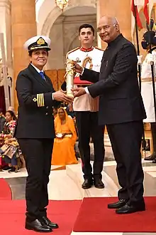 She was awarded the International Maritime Organization Award in November 2016 for her successful courageous rescue operation which she led from the front in June 2015 rescuing seven fishermen who were trapped at the Bay of Bengal in a sinking boat which capsized due to engine failure and breakdown of the boat's anchor as a result of a sea storm.[6][7][8] The Government of India nominated her for the relevant award recognising her national duty and also notably became the first woman to receive the IMO Bravery award.[9]