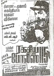 Ragasiya Police 115 (transl. Secret Agent 115) is a 1968 Tamil-language spy film, directed by B. R. Panthulu. The film stars M. G. Ramachandran (MGR) and J. Jayalalithaa, supported by M. N. Nambiar, S. A. Ashokan and Nagesh. It was released on 11 January 1968,[1] and ran for 100 days in theatres, becoming hit at the box office.[2][3]