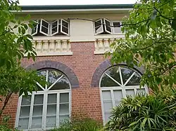 Despite their similarities, each Depression-era brick school building was individually designed by a DPW architect, which resulted in a wide range of styles and ornamental features being utilised within the overall set. These styles, which were derived from contemporary tastes and fashions, included: Arts and Crafts, typified by half-timbered gable-ends; Spanish Mission, with round-arched openings and decorative parapets; and Neo-classical, with pilasters, columns and large triangular pediments. Over time, variations occurred in building size, decorative treatment, and climatic-responsive features.[37] The Chief Architect during this period was Andrew Baxter Leven (1885–1966), who was employed by the Queensland Government Works Department from 1910 to 1951, and was Chief Architect and Quantity Surveyor from 1933 to 1951.[38] The DPW architects involved in the design of Rainworth State School were Raymond Clare Nowland and Harold James Parr.[39][1]