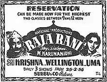 After the success of Parasakthi (1952), many producers approached M. Karunanidhi to write scripts for them. One of the films he wrote was Raja Rani.[2] Sivaji Ganesan was cast as the lead actor, making this the first of 18 collaborations with director A. Bhimsingh.[3][4] The film was shot at the now-closed Newtone Studios in Kilpauk. Its owners were Dinshaw K. Tehrani and Jiten Banerjee, who supervised the audiography and cinematography respectively. G. Vittal Rao handled the camera. The dances were choreographed by Hiralal and Sampathkumar.[2][5] The film also features two plays: one based on Socrates,[6] and another on Cenkuttuvan.[7]