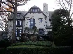 The style of which this house was built is a neo-Tudor style.[3] It was designed by the prominent Brooklyn architects Koch & Wagner.[3] The house stands at 2+12 stories and is faced in stucco pierced by random bricks and stones.[3] The house maintains its original wooden doors with iron strapping; the original leaded glass windows and slate roof are also maintained.[3] It is located in a suburban setting of single-family homes and is surrounded by mature trees and bushes.[3] The house is also situated on the crest of a hill and contains a terraced flagstone walkway leading from the street to the front door.[3] The house's attached gable is inset into the hill at the basement level.[3] The house is faced with random ashlar stones and has an opening that is stone-framed and arched segmentally; this opening is filled by wooden doors with small plain glass lights and metal strapping.[3] The house is three bays wide with a central, full height, projecting gable capped/adorned by a clipped roof.[3] The doorway, within the gable, is built within a round arched, stone-trimmed opening and holds a wooden door with a small, rectangular window covered by a decorative iron grille.[3] There is an original iron and glass lantern situated on the wall beside the door.[3] Additionally, there is a small, rectangular window within the gable above the doorway, along with a large, double-height window to the side of the entrance.[3] This window has leaded glass casements with a decorative stained glass motif of a knight on horseback at the bottom center of the window; this window is fronted by a small, iron balcony.[3] A pair of small rectangular windows are built near the top of the gable and are surrounded by half-timber framing.[3] There is a stucco-faced chimney on one side of the central gable.[3] The lower section of the chimney projects toward the front and creates another small roof and shape variety.[3] There is a small, open stone porch on the west side of the house's main section, while the east side contains a one-storey, stone-faced sun room with floor-to-ceiling casement windows.[3] This area is recessed behind a patio and the stone walls that rise up from the garage below.[3]