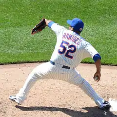 Ramírez earned a save on April 6, 2011, by pitching 1⁄3 of an inning to escape a bases-loaded situation in the Giants' 8–4 win over the Padres.[53] On June 18, he pitched a season-high 2+1⁄3 innings, allowing no runs in a 4–2 loss to Oakland.[54] He allowed a season-high four runs in 2⁄3 innings and took the loss on June 30 in an 11-inning, 5–2 defeat to the Cubs.[55] On August 5, in an eventual 9–2 loss to Philadelphia, Ramírez hit Shane Victorino with a pitch, and a brawl started. Ramírez was subsequently ejected from the game.[56] Afterwards, Philadelphia talk-show host Tony Bruno sparked controversy by posting on his Twitter account that Ramírez was an illegal alien, although he later removed the post.[57] On September 4, Ramírez struck out four batters but gave up a run in 1+2⁄3 innings in a 4–1 loss to the Diamondbacks.[58] Two days later, he got his final save of the year when he threw a scoreless 1⁄3 of an inning in a 6–4 victory over San Diego.[59] In 66 games that season, Ramírez had a 3–3 record, a 2.62 ERA, four saves, 66 strikeouts, and 68+2⁄3 innings pitched.[7]