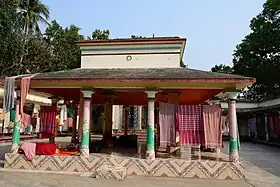 In the front of the temple building, there is a nata-mandir in the middle of the temple premises, which is used for Sankirtan and rest of the visitors. The nata-mandir is open all around and there are no walls around it. There are twelve pillars around the nata-mandir and four pillars in the middle part. The four central pillars support the main roof of the nata-mandir. Four sloping chalas start from the four sides of the nata-mandir and meet at the four walls above the four pillars in the middle part. Above these walls lies the original roof. The central pillars of the nata-mandir are larger in diameter than the surrounding pillars.[10]