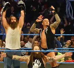That same night, Orton and Wyatt were revealed as members of Team SmackDown for Survivor Series.[240] At Survivor Series, Team SmackDown defeated Team Raw, where Orton and Wyatt became the last two surviving members of their team.[241] On the November 29 episode of SmackDown Live, Orton and Wyatt defeated American Alpha to earn a shot at the SmackDown Tag Team Championship against Heath Slater and Rhyno.[242] At TLC: Tables, Ladders & Chairs, they won the titles, marking Orton's first tag team championship in a decade. It was later announced that Harper was also champion under the Freebird Rule.[243] On the December 27 episode of SmackDown Live, they lost the SmackDown Tag Team Championship to American Alpha in a fatal four-way tag team elimination match, after Orton accidentally hit Harper.[244] On January 29, 2017, at the Royal Rumble, Orton won the Royal Rumble match for the second time in his career by lastly eliminating Roman Reigns.[245] Despite this, Orton came out after Wyatt successfully defended the WWE Championship and relinquished his shot at the title on the February 14 episode of SmackDown Live, basically giving his full devotion to Wyatt and leaving the main event of WrestleMania in the air. On the February 28 episode of SmackDown Live, Orton turned on Wyatt while Wyatt was delivering his promo and was seen entering Wyatt's compound, where he claimed that despite being Wyatt's home, it was not his home and declared his intentions to burn the soul of "Sister Abigail". He then set the entire compound on fire after stating that he would face Wyatt at WrestleMania 33, turning face again. On the March 7 episode of SmackDown Live, Orton defeated AJ Styles to become the number one contender for the WWE Championship.[246] On April 2 at WrestleMania 33, Orton defeated Wyatt to win the WWE Championship for the ninth time, which was also his first WWE Championship win at WrestleMania and 13th overall world championship.[247][248] On the following episode of SmackDown Live, Wyatt challenged Orton to a "House of Horrors" rematch,[249] but after Wyatt was moved to the Raw brand as a result of the Superstar Shake-up, it was made a non-title match and scheduled for Raw's Payback on April 30,[250] which he lost.[251]