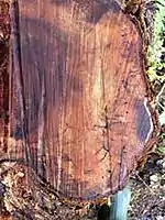 Boring Beetle Tunnels in Ohia Tree Stump. Researchers are studying if Boring Beetle's excrement is a pathway for ROD pathogen's to spread to the Ohia Trees.[12]