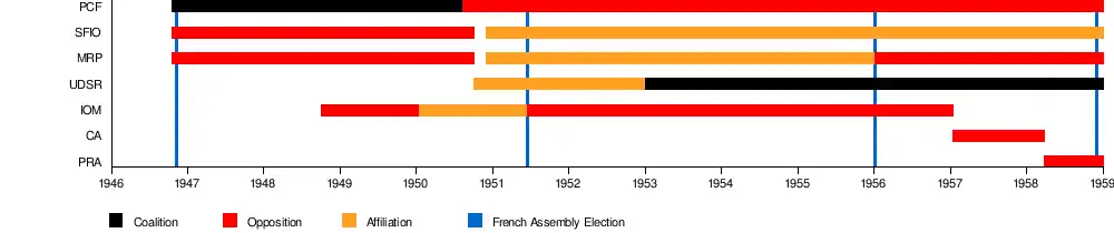 These two factors combined to make many of the National Assembly delegates, particularly those with large Catholic constituencies in their colonies, feel uneasy about the coalition with the Communist party. Apithy, from Dahomey, in particular raised the issue many times and when his efforts to end the coalition failed, he formed a new regional political party in September 1948, the Indépendants d'Outre-Mer (IOM).[20] The IOM included Apithy, the three new members from the Upper Volta, and three other members from throughout West and Equatorial Africa.[18] The formation of the IOM coincided precisely with the naming of a new Prime Minister, Robert Schuman, to present his cabinet in what would be a very close vote. During the debate on this cabinet, Apithy presented Schuman with a number of questions regarding the future of the colonial arrangement. When Schuman gave the closing speech before a vote to confirm his cabinet, Apithy's questions were the only ones which he did not address at all. Apithy was infuriated by this perceived slight and so cast the whole seven votes of the IOM (including those of the three absent Upper Volta members) against the cabinet. Schuman lost by six votes and was replaced by Radical Party politician Henri Queuille.[21] Queille made a point of meeting with Apithy before the presentation of his cabinet and answered all of his questions in his first speech to the National Assembly.[21]