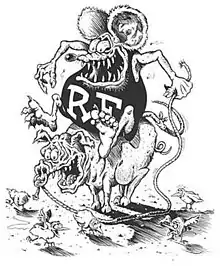 Rat Fink[1] is one of several hot rod characters created by artist Ed "Big Daddy" Roth, one of the originators of Kustom Kulture of automobile enthusiasts.[2] Roth conceived Rat Fink as an anti-hero to Mickey Mouse. Rat Fink is usually portrayed as either green or gray, comically grotesque and depraved-looking with bulging, bloodshot eyes, an oversized mouth with sharp, narrow teeth, and wearing red overalls with the initials "R.F." on them. He is often seen driving cars or motorcycles.[3]