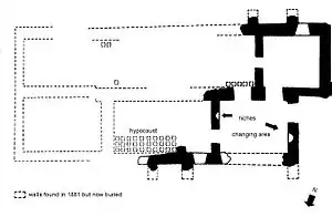 The remaining fragment appears to be the west end of a building which was about 40 ft/12 metres wide and about 90 ft/27 metres long (see plan). It consisted of a suite of rooms arranged in a double sequence along the building. The entrance and changing area (apodyterium) contains niches, perhaps originally for statues. The use of the other rooms is not known, but there would have been a range of warm rooms, a hot bath and a cold plunge. The north and south walls have external buttresses which were probably intended to take the weight of a vaulted roof.[3] Excavations were carried out at the bath house in 1881. Remains of the hypocaust heating system were uncovered, but they have since been reburied.[4]