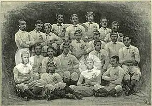1871 England squad, with Ravenscourt Park players A. Davenport (left) and J. M. Dugdale (right) highlighted