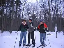 Three enthusiasts complete a day of cross-country skiing in Ravenswood Park in 2005.