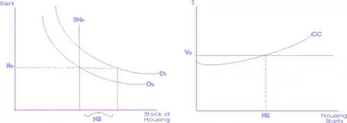 In the adjacent diagram, the stock of housing supply is presented in the left panel while the new flow is in the right panel. There are four steps in the basic adjustment mechanism. First, the initial equilibrium price (Ro) is determined by the intersection of the supply of existing housing stock (SH) and the demand for housing (D). This rent is then translated into value (Vo) via discounting cash flows. Value is calculated by dividing current period rents by the discount rate, that is, as a perpetuity. Then value is compared to construction costs (CC) in order to determine whether profitable opportunities exist for developers. The intersection of construction costs and the value of housing services determine the maximum level of new housing starts (HSo). Finally the amount of housing starts in the current period is added to the available stock of housing in the next period. In the next period, supply curve SH will shift to the right by amount HSo.