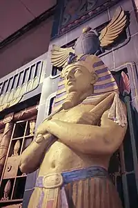 Architect George Kingsley (1870-1956) and sculptor Fritz Albert designed the warehouse. Albert was responsible for the exterior's terra cotta ornamentation. The moving company founders, John and William Reebie, are represented by the two statues of Ramses II that flank the main entrance. William Reebie (1859-1921) founded the company in 1880. The Reebie brothers wanted a building in a distinctive style, and John Reebie had seen another Egyptian Revival storage building in Stockton, California (designed in 1918 by Glenn Allen for the Dawson-Mayflower Moving Company). John Reebie had also visited Egypt at some time before 1921 as well.