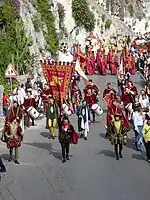 The Amalfi procession represents the society of the Campania Republic at the beginning of the eleventh century, when it reached its peak. Inside there are representatives of the various social classes: the magistrates, the military and the people. In particular parade the duke (the highest city authority) and the knights with sword, whose vestments were later taken by members of the Order of the Knights of St. John of Jerusalem. The proposed episode is that of the marriage between John I, son and co-regent of the Duke Mansone I, and the regal salernitan noblewoman; the marriage marked for the young the passage to the adult age and entry into the political environment. The costumes for the Amalfi procession were designed in the fifties by the scenographer Roberto Scielzo, through analysis of historical sources. The realization boxes, as well as the clothes, are still exhibited in the Municipal Museum of the Amalfi Town Hall.