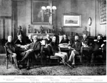 The Free Trade Party gained 8 seats at the 1895 election, largely a result of independent members joining the party and they were still 5 seats short of a majority.[7] The party lost 13 seats at the 1898 election,[8] including ministers Jacob Garrard, Albert Gould and Sydney Smith,[9] mostly to the Protectionist Party which contested the election under the name "National Federal Party", reflecting the party's focus on Federation. The ministry's first re-shuffle occurred in August 1898 as a result of that election, with James Hogue, Charles Lee and Varney Parkes appointed to the ministry. Glebe (James Hogue) was the only electorate in which the by-election was contested.[10] Jack Want resigned as Attorney General in April 1898 as a result of Reid's famous Yes-No speech in order to oppose federation, rejoining in June 1898 after the first referendum was defeated.[11] Want resigned again in April 1899 and Reid was appointed Attorney General, initially in addition to his role as Colonial Treasurer, before relinquishing that role in the second re-shuffle in July 1899. The Reid ministry managed to hold on as a minority government until 13 September 1899,[12][13] when Reid resigned in order to focus on ensuring adequate provisions were made for New South Wales in the federation of the Australian colonies into a Commonwealth.[14]