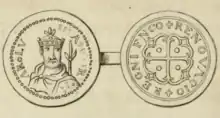 It may have been used as early as 813 by Charlemagne, but it was definitely used by his successor as emperor, Louis the Pious, on a metal seal during his religious reforms. It originally referred to the internal religious renewal of the Frankish empire. The motto was used only sporadically by the later Carolingians.[1] Louis's younger son, Charles the Bald, put it on his coins early in his reign probably to appeal to the ethnically Frankish nobility of his kingdom.[3] After he became emperor in 875, he combined on his new seal his father's formula with that of his grandfather, renovatio Romanorum imperii ("renewal of the empire of the Romans"), to create a new motto: renovatio imperii Romani et Francorum.[4] The motto renovatio regni Francorum was used again by the emperors Charles the Fat (881–888), Guy (891–894), Lambert (892–898) and Arnulf (896–899).[5][6]