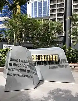 The sculpture is located in Emma Miller Place, and was unveiled in 2007 to mark the first vote by women in an election in the State of Queensland in 1907, and the centenary of women's suffrage in Queensland in 2005.[1][2] It was designed by Brazilian artist Cida de Aragon, in collaboration with Steffen Lehmann.[2]