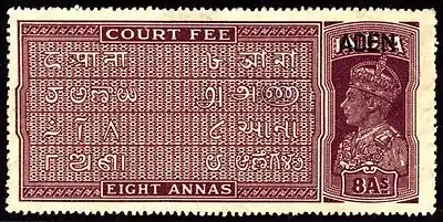 The first set of Aden Court Fee stamps was India's King George V stamps overprinted. Only the 8a and 1r values are recorded, but possibly more exist. The King George VI stamps were also similarly overprinted. Thirteen values were issued, ranging from 2a to 20r.[2]