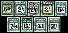 Malta's first passport stamps were issued in 1933, and they were inscribed FEE PAID and PASSPORT. The design was printed in deep green, with the value in black. Reprints and additional values to this issue continued until 1967.[4][3]