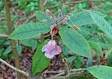Rhododendron glischrum (粘毛杜鹃) is a species of flowering plant in the family Ericaceae.[2] It is native to northeastern India, southern Tibet, Myanmar, and northwestern Yunnan, China, where it grows at altitudes of 2,400–3,600 m (7,900–11,800 ft). It is an evergreen tree[3] that typically grows to 2.4–7 m (7.9–23.0 ft) in height, with leaves that are oblong to broadly oblanceolate and 14–22 × 4.6–6.5 cm in size. The flowers are pink with purple flecks and basal blotch.