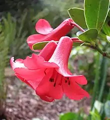 Rhododendron lochiae is a small shrub with glossy, elliptic leaves. In spring and summer it produces terminal clusters of waxy, red bell-shaped flowers. Each flower is about 5 cm long and 3 cm wide, and occurs in groups of up to six per cluster.