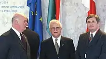 Cachia Caruana (right) at the signing ceremony for the 2003 Treaty of Accession in Athens, pictured with Eddie Fenech Adami (centre) and then-Minister of Foreign Affairs Joe Borg (left)