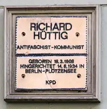 Richard Hüttig (Pronounced OO-teg; 18 March 1908 in Roßleben-Bottendorf – 14 June 1934 in Berlin, executed) was a prewar German Communist who was put to death, apparently more for his political convictions than for any crime he committed.