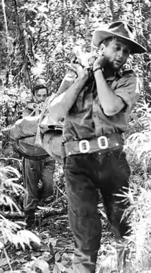 On 12 July 1961, after cutting their way through miles of thick brush with machetes, carrying their now limited supplies, and working off compass bearings and the stars, the expedition finally came across the river on the border of the Mato Grosso and Pará states. A camp with a jetty was built and the five porters started hewing two dugout canoes out of fallen tree trunks using axes and adzes. After this was completed the team was ready to descend the Iriri.[8][9][10] The survey team then concluded that the river they found was not in fact the Iriri, but that they were 7 miles (11 km) off course. By late August, after adjusting their course and still not able to locate the river, the team began running low on supplies, especially food. It was decided that Hemming should head back to Rio alone and arrange for food and equipment to be flown out by the Brazilian Air Force. Arriving back in Cachimbo during the first week of September, Hemming was given the news by Lambert that Mason had been killed. It turned out that on 3 September, Mason had been heading back from Cachimbo by himself with a few supplies when an unknown indigenous hunting party laid an ambush and killed him with 6-foot (1.8 m) long bamboo poison arrows and clubs.[11] When Mason did not return, Lambert and a scout went looking for him. Hemming describes in his 2004 book, Die If You Must, what they discovered on the trail that they had cut:[12]