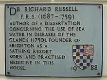 Russell's efforts have been credited with playing a role in the populist "sea side mania of the second half of the eighteenth century",[17] although broader social movements were also at play.[18] The plaque on the wall of the Royal Albion Hotel says simply: "If you seek his monument, look around".[19] After Dr Russell's death in 1759, his house was rented to seasonal visitors, including the brother of George III the Duke of Cumberland in 1779.[2] On 7 September 1783 the Prince Regent (then the Prince of Wales) visited his uncle. The Prince's subsequent patronage of the town for the next 40 years was central to the rapid growth of the town and the transition of the fishing village of Brighthelmston to the modern town of Brighton.[20]