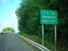 Most of Ridge Road between Lewiston and the city of Rochester 70 miles (113 km) to the east passes through rural, outlying areas of Niagara, Orleans, and western Monroe counties. While NY 31, a parallel highway 5 miles (8 km) to the south, passes through most of the region's largest communities—including the city of Lockport and the villages of Medina, Albion, and Brockport—Ridge Road and NY 104 bypass them entirely. Instead, the two-lane road passes through only small hamlets built up around junctions between NY 104 and other state routes.[5] This changes in central Monroe County, however, where Ridge Road (known locally as West Ridge Road) is six to nine lanes wide[6] as it serves as the backbone of a large commercial district in the town of Greece.[7] Once in Rochester, West Ridge Road enters areas more residential and industrial in nature, including the sprawling Eastman Business Park near the Genesee River.[8]