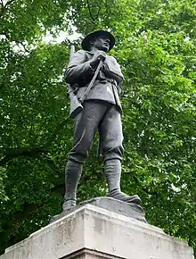 The memorial has a curved screen and central pylon of Portland stone, with three bronze statues by the Scottish artist John Tweed: on the pylon, a helmeted rifleman in First World War uniform marching with slung rifle (modelled on Rifleman Ephraim Alfred Dudley); and at ground level, in front of the screen to the left, a rifleman in 1806 pattern uniform with a Baker rifle, and, to the right, an officer with sword from 1800, when the Experimental Corps of Riflemen was formed.