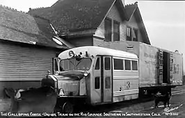 The RGS had the displeasure of experiencing yet another economic downfall, the Great Depression. This was a massive hit on the RGS and affected it to the point where they could not afford to operate one single steam locomotive (Paying for Fuel, Paying the Engineer and Fireman to operate the locomotive, etc.). However, they still had the responsibility to ship US Mail. That could have been the end of the line for the RGS, but Chief Mechanic Jack Odenbaugh thought otherwise. In 1931 he devised a way to construct seven homemade "railcars" that would be cheap to build and operate, capable of transporting US mail and a few passengers. The official names given from the RGS were "Motors", but these railcars would later be unofficially named "Galloping Geese" by Railfans because of how they looked, operated, and sounded.- Waddling down the poorly maintained, unlevel RGS tracks with a silver-painted body and hood covers that looked like goose wings when opened up to prevent the motor from over-heating, and the horn sounding somewhat like a honking goose. These railcars are arguably one of the most iconic aspects of the RGS and are known by most narrow-gauge railfans. The first Goose (RGS Motor #1) was built from a recycled Buick body, frame, and engine, and #2 would be as well, but with a larger and enclosed freight compartment, a requirement to haul US mail. Motors #3 through #5 and #7 were built from Pierce Arrow bodies, but with freight compartments the size of a boxcar. Motor #6 was made from a Buick as well, but it was designated for Maintenance of Way service, and only had a flatbed attached behind the cab. Later on, Motors #3 through #5 would receive replacement Wayne Buss bodies. These motor cars indeed were successful and handled daily services until 1940 when the RGS could afford to run regular freight trains. Even after that, the Geese completely replaced revenue-generating passenger trains until abandonment; almost all passenger coaches the RGS owned at the time had been put into MOW service since.[4][5]