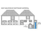 On the river at Snettisham stands a watermill TF68083346 52°52′21″N 0°29′45″E / 52.8724°N 0.4959°E / 52.8724; 0.4959. This was built in 1800 for £800 at a time when bread was scarce and it was built by the community of Snettisham for the people of the village. It is believed that the present mill was built on an existing site although virtually no records have so far been found apart from the fact that Thomas Stonne was a Snettisham miller in 1626. At the time of Domesday, there were seven mills in Snettisham more than in any other Norfolk village. Today's mill is very small and originally consisted of a single small structure built of local dark brown carrstone with a pantiled roof. In 1877, machinery was improved and a granary and wagon store were added to the complex. The mill had three pairs of stones and unusually the larger two pairs were driven from above and the smaller pair from below, the latter pair required less power and was used when water levels were low. The mill worked on until 1940 producing flour and after that was used for animal feed production until 1960. The mill was restored, and brought back to working order by 1984. It was sold in 2008, and a planning application lodged to part convert it to holiday accommodation.[2] Permission was refused. 1 September 2008.[3]
