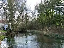 The river then resumes its northward course, and there are a number of sluices and weirs, which were part of Andwell Mill. The mill building has survived, a massive structure dating from the 17th century, but heavily modernised around 1900.[7] Andwell Mill Trout Farm now operated a little further downstream. It produces smoked trout, some from locally-grown fish and some from imported fish. The business began in 1979, and in 1993 won a planning appeal to allow them to extend, which had been declined because so much of the fish was imported. However, the amount of locally sourced fish that could be produced was restricted by the volume of water that their abstraction licence allowed them to take from the river.[8] The name Andwell is derived from two words both meaning "well". "An" is from the Celtic language and "well" from Saxon.[5] At Water End the river is crossed by the A30 road, passes a large mobile home park, and then is crossed by the South West Main Line railway. Just before a bridge carrying Newnham Lane is the site of Lyde Mill. The mill house dates from the 17th and late 18th centuries, with some modern extensions.[9] The river then meanders across open countryside, passing very close to the Loddon, and then moving away to reach the early 19th century Hartley Mill. The mill itself had two storeys and an attic, with an attached two-storey mill house. Both parts have been adapted to form a single house, and although the water wheel has gone, a number of iron wheels from the original machinery have been retained as decoration.[10] Shortly after the mill, the river joins the Loddon.[6]