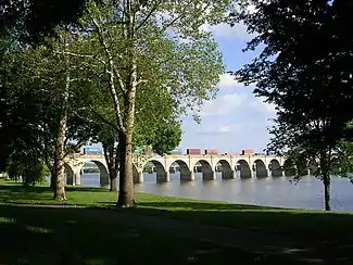 The park runs parallel to the Susquehanna River between the shoreline and Front Street, from Vaughn Street at the north to the I-83 John Harris Bridge at the south. It includes a concrete waterfront esplanade as well as greenspace on the riverbank first developed during the City Beautiful Movement in the early 20th Century by Warren H. Manning as one of the first riverfront reclamations by American cities.[1] Riverfront Park overlooks views of the river, City Island, Wormleysburg and Blue Mountain in the distance. Riverfront Park is also part of the larger Capital Area Greenbelt and maintains bike lanes and paved paths. Along the park are many statues, memorials, a series of exercise pits, gardens, public art installations, and a Harrisburg Centennial time capsule. Special areas include the Sunken Gardens, gravesite of John Harris Sr., and Kunkel Memorial Plaza.