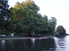 The island is a meadow lightly covered with trees with dense patches, shrubbery and reeds at each end. The former common land meadow is publicly open and Metropolitan Green Belt.[1] It is a long area of open riverside on the side of the river opposite the Thames Path — from here the point of Sunbury Lock Island can be seen. It is connected to the bank by an elegant arched footbridge with simple metal balustrades and separate painted round handrails and in dry periods four-wheel vehicle access is possible via a ford of the narrow backwater separating it from the land. Rivermead was originally two islands, the much smaller, downstream part being Swan's Rest, since the late 20th century completely joined, remaining part of Elmbridge as its fishing rights were anciently conferred to the parish south of the river.[2]