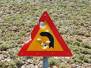 The first road signage on Greek roads with contemporary signs was made in 1924 by ELPA (Elliniki Leschi Periigiseon kai Aftokinitou, lit. translated: Hellenic Club of Tours and Car),[4] which took over the road network's signage until 1957, when it was taken over by the state.[5] The signs were subject to the provisions of the Geneva Protocol on Road Signs and Signals.