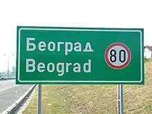 The road signs, used on the Serbian road network, are regulated by the "Regulation of Traffic Signs" (Serbian Cyrillic: Правилник о саобраћајној сигнализацији, Serbian: Pravilnik o saobraćajnoj signalizaciji), which was last time modified in 2017.[1]