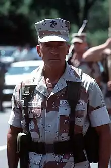 He then assumed command of 2nd Battalion, 8th Marines at Camp Lejeune, North Carolina from July 1981 to February 1983, and commanded the 8th Marine Regiment from 8 February 1983 to 22 May 1984.[3] He was promoted to colonel in May 1983 while at Camp Lejeune. Johnston relinquished command of 8th Marines to Col. John P. Brickley. Johnston was assigned to Quantico in May 1984 to assume command of Officer Candidates School. While serving in this capacity, he was selected for promotion to brigadier general in December 1986. He was advanced to that grade on August 21, 1987, and assumed duty as the Assistant Division Commander, 3rd Marine Division in September 1987. He was assigned additional duty as the Commanding General, 9th Marine Amphibious Brigade in November 1987. On May 26, 1988, General Johnston was assigned as the Commanding General, Marine Corps Base, Camp S.D. Butler. On May 4, 1990, he was promoted to major general and on June 15, 1990 he was assigned to United States Central Command as the Chief of Staff.